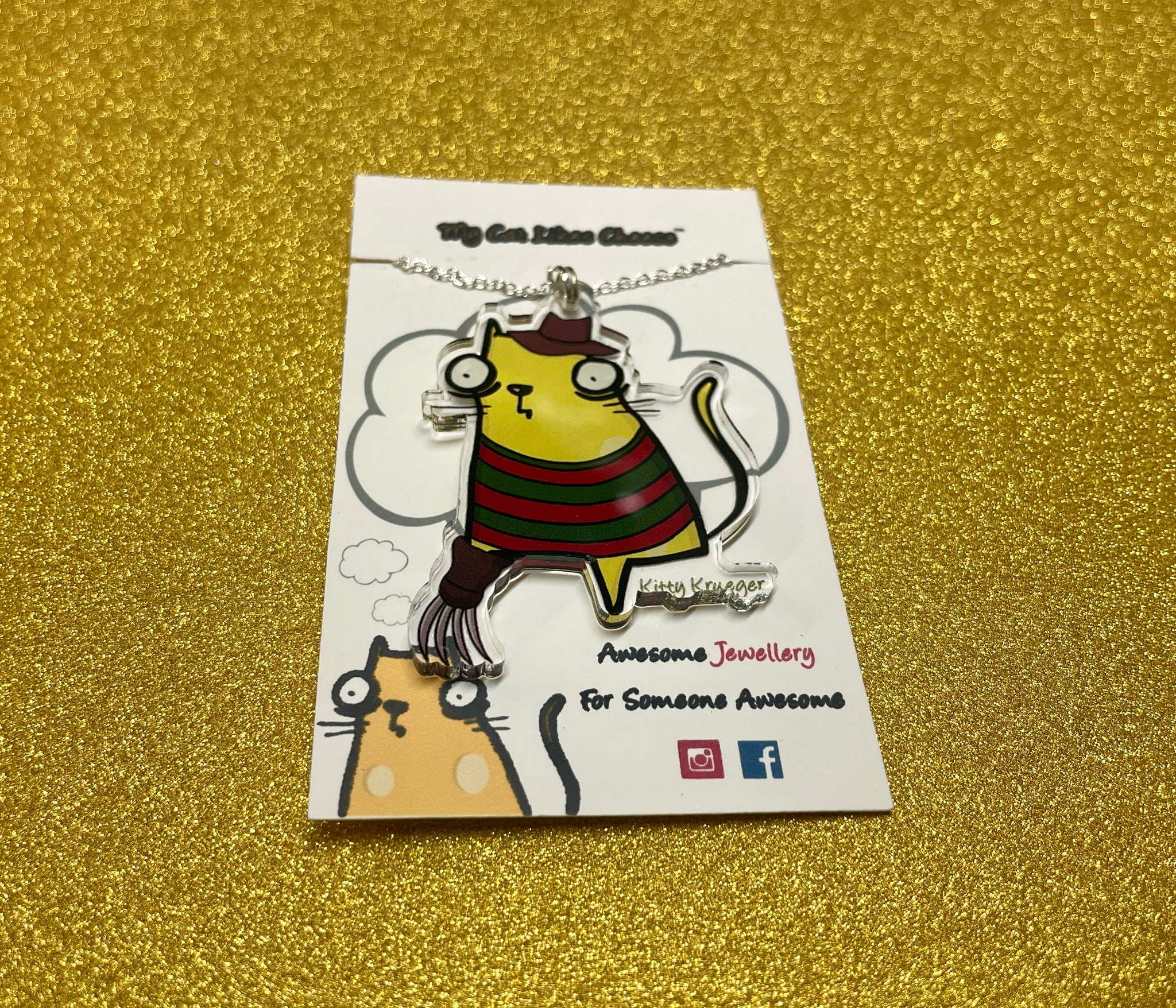 ‘Kitty Krueger’ Eco Acrylic Horror Cheese Cat Pendant Necklace on Silver Plated Chain